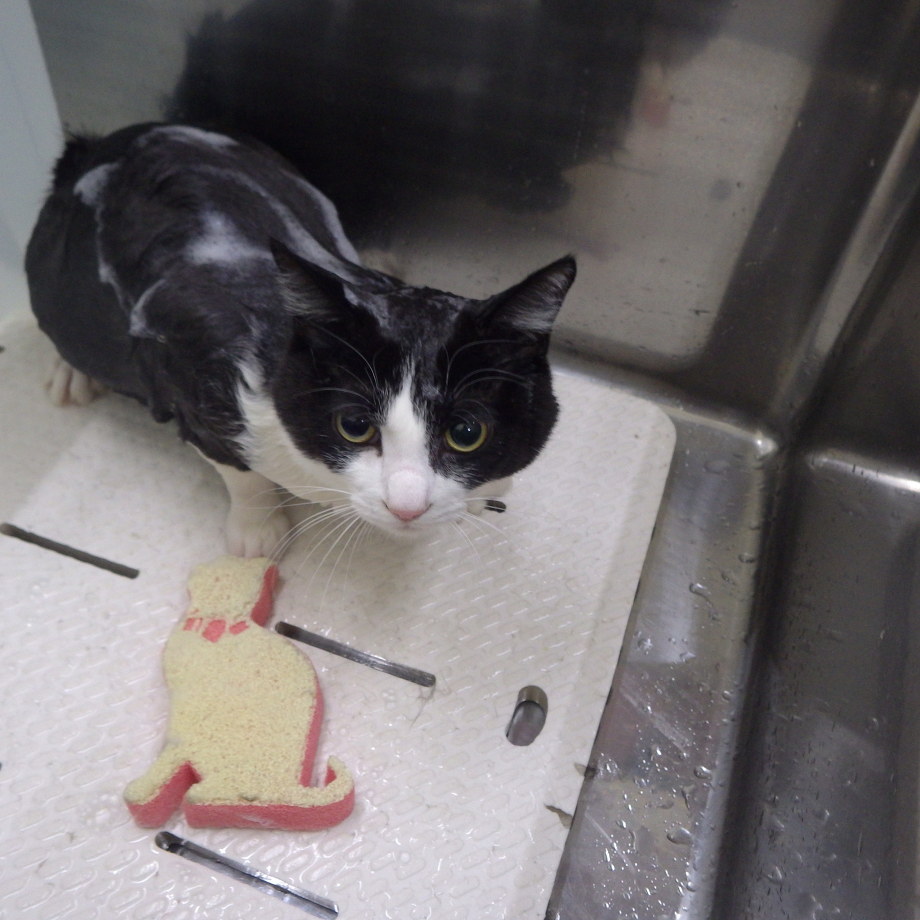 お風呂の後は、猫スポンジでシャンプー